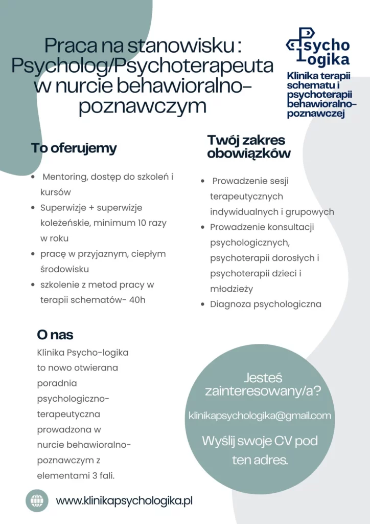Praca na stanowisku Psycholog/Psychoterapeuta w nurcie behawioralno-poznawczym